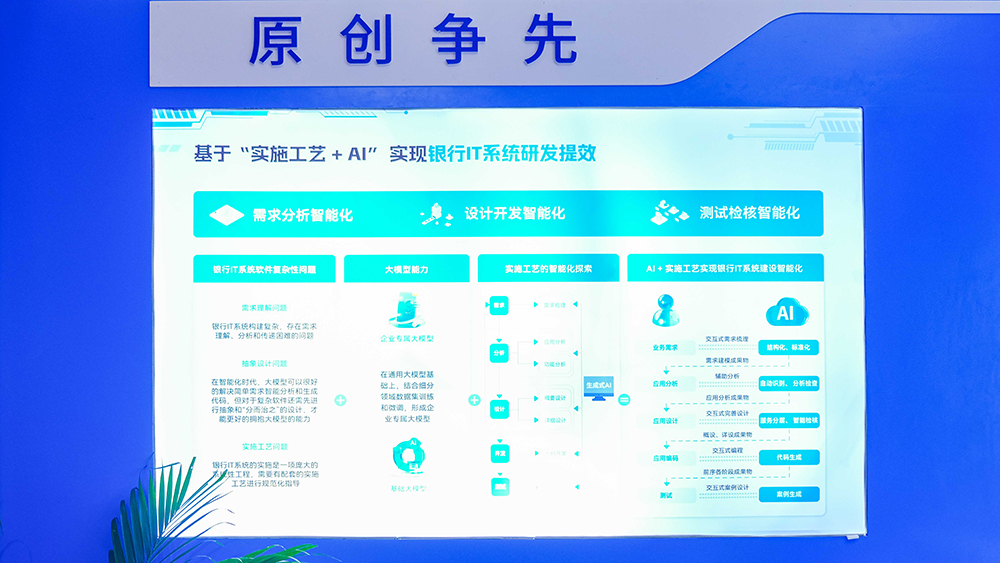 隨著人工智能時代的來臨,長亮科技認為未來軟件工程將向著智能化編程、AI大模型的方向進化,并創新探索出 “實施工藝+AI”這一前沿成果。通過將傳統業務需求轉化為結構化的數字需求資產,實現了從傳統代碼驅動到數字資產驅動的轉變,同時利用生成式AI技術在各個研發階段提供智能輔助,助力銀行重塑研發高效新模式,實現智能化的系統建設。