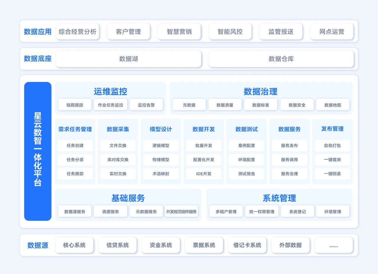 針對(duì)上述這些痛點(diǎn),長(zhǎng)亮科技為數(shù)據(jù)類項(xiàng)目實(shí)施團(tuán)隊(duì)著手打造了“星云數(shù)智一體化平臺(tái)”。作為面向數(shù)據(jù)運(yùn)營(yíng)的一體化平臺(tái),其設(shè)計(jì)方向主要是滿足數(shù)據(jù)倉(cāng)庫(kù)和數(shù)據(jù)湖的數(shù)據(jù)加工需求,為應(yīng)用系統(tǒng)提供加工好的數(shù)據(jù)。并結(jié)合DataOps數(shù)據(jù)運(yùn)營(yíng)方法論,實(shí)現(xiàn)數(shù)據(jù)資產(chǎn)的加工、建模和對(duì)外服務(wù)供給。對(duì)數(shù)據(jù)開(kāi)發(fā)而言,星云平臺(tái)可以有效降低管理成本,促進(jìn)規(guī)范統(tǒng)一和落地,提高開(kāi)發(fā)效率和質(zhì)量。