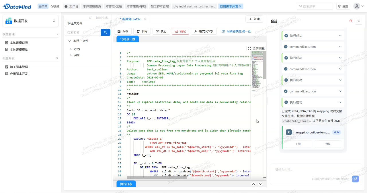 在基于本體構建報表時,用戶可通過提示詞描述目標表結構或導入物理模型文件。Mapping Agent自動分析本體與目標表間的映射關系,生成可預覽的映射規則與ETL腳本,保存后即可直接應用于數據加工,實現從本體層到應用層的語義貫通與數據交付。