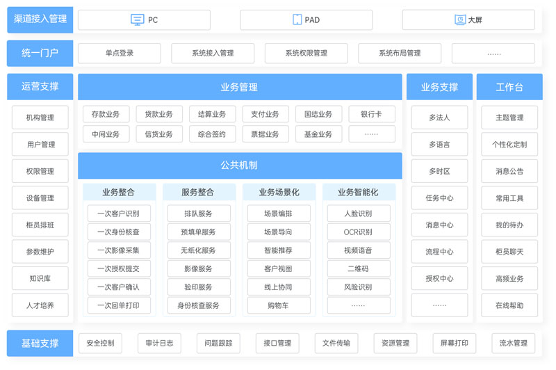 定位于面向場景設計的、能夠支撐銀行網點一體化信息建設的新型應用平臺,設計上以客戶為中心,以智能化、高效運營、業務統一化為目標,同時整合網點內外所有人、設備和系統,將業務流程打通,面向客戶進行數據共享,做到一次識別、一次驗證、一次確認、一次打印,助力銀行提高客戶體驗度、提升柜員作業效率、降低網點操作風險,全面提升網點的營銷能力和服務能力。